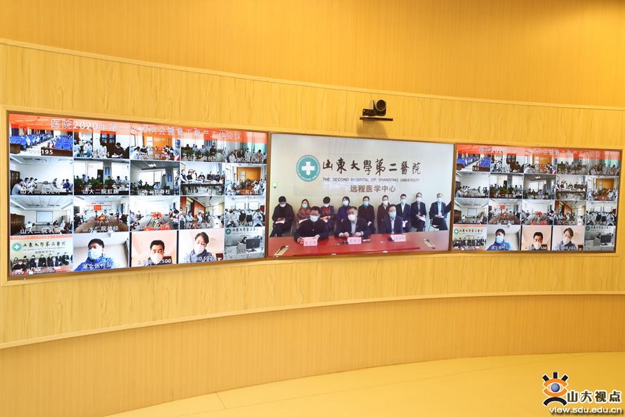 本次视频会议设立了1个主会场和17个分会场,主会场设在医院远程会诊中心,全体院领导在主会场参加会议;临床科室正副主任、正副护士长、支部书记在指定分会场通过远程会诊平台参会;职能部门正副主任、副高职称及以上人员,援湖北抗疫国家医疗队成员,南部院区/济南善德养老院部分成员等通过微信企业号收看了视频会议。