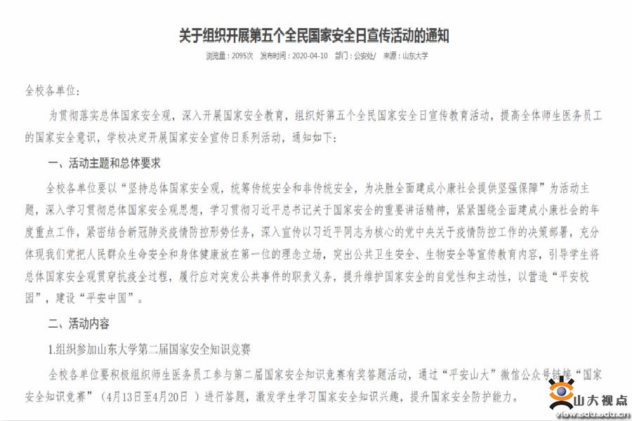 开展知识竞赛。学校组织一校三地的山大师生积极参加山东大学第二届国家安全知识竞赛,激发学习国家安全知识兴趣,提升国家安全防护能力。公安处通过“平安山大”微信公众号发布参与知识竞赛的平台,校内新媒体如“学生在线”“山大研究生”“青春山大”等微信公众号积极帮推宣传,学生工作部门领导在分管学生工作负责人群里转发学校通知,督促各学院和培养单位落实工作。