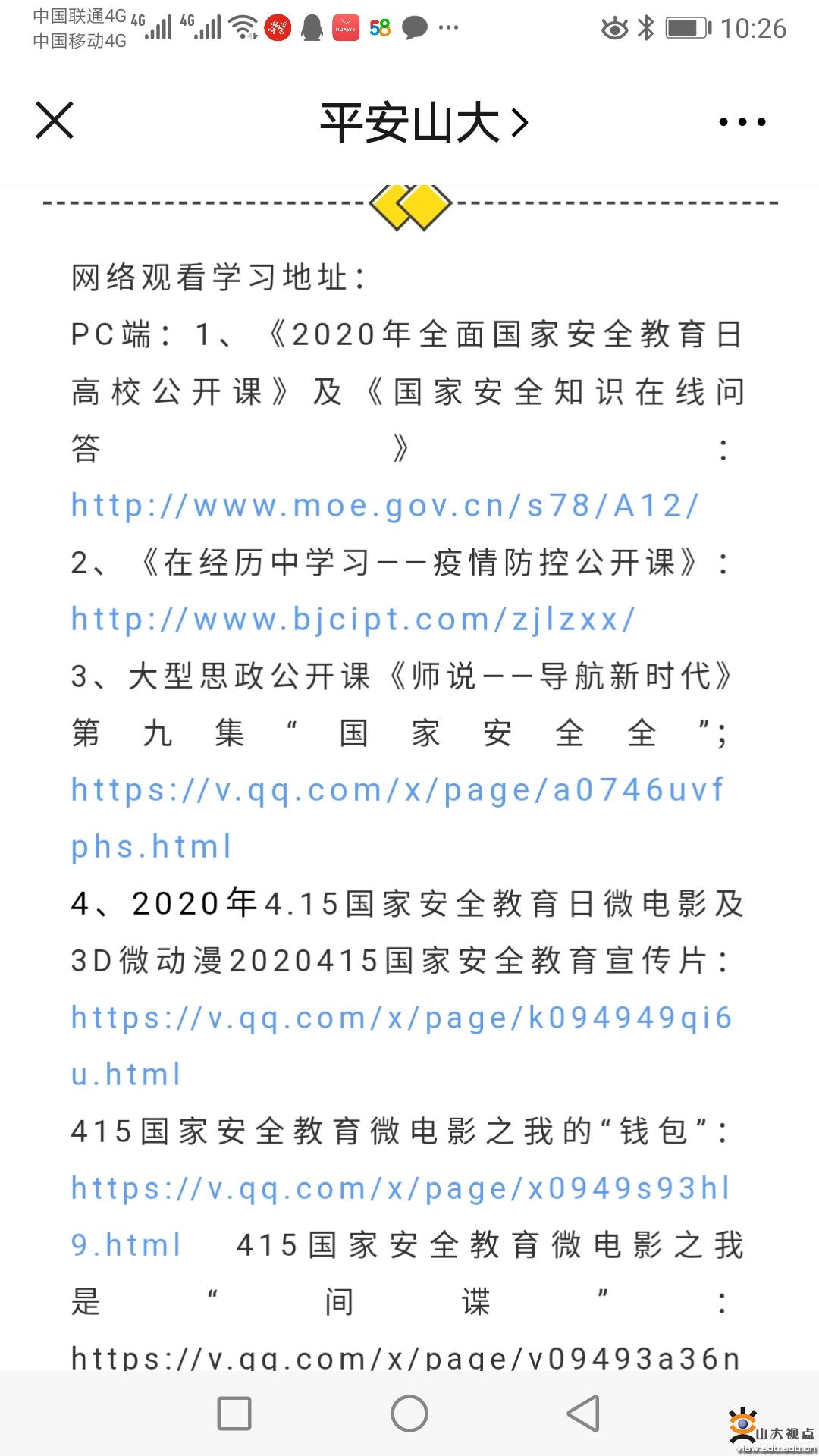 营造宣传氛围。疫情期间,学校创新宣传教育形式,重点开展线上国家安全教育宣传活动,通过新媒体平台积极转发权威部门、主流媒体相关宣传内容,组织创作主题教育微视频、音频、图解、微动漫等新媒体产品,加大推送宣传力度,重点宣传在抗疫一线用实际行动维护公共卫生安全、捍卫国家安全的先进典型及感人事迹,并统筹做好信息安全等其他安全领域的宣传推送。“平安山大”公众号充分发挥学校安全教育平台的作用,连续推送5期专题文稿;“平安山大”企业号也同步发通知和推出宣传文章;公安处充分利用宣传栏、横幅、LED屏等营造教育宣传氛围,在学校的重要路口设置宣传教育展板,集中在多校区的公共区域LED屏展示国家安全标语宣传内容。