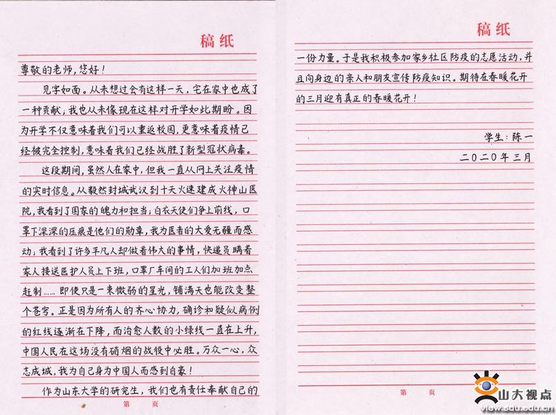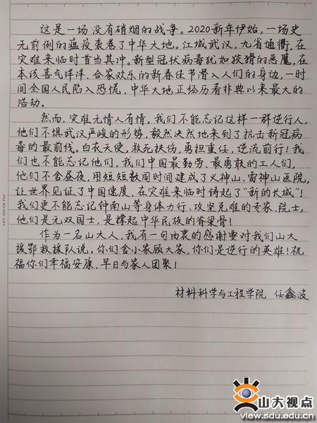 自疫情发生以来,研究生们受到了来自国家、社会、学校、导师、辅导员等方方面面的关切和温暖,也被白衣战士驰援武汉的奉献精神所鼓舞。为回应一封封导师和辅导员的来信,表达对医护人员的赞颂之情,在此次云战“疫”研究生线上书法大赛中,研究生们回归简单的纸笔书写,道出内心质朴的情感,让最有力的文字在笔端安静流淌,将真切的话语赠予两个月以来最想念的山大家人。组委会收到的参赛作品中,不乏内容丰富感人、书法水平较高、风格形式特别的佳作。获奖作品里硬笔书法功底扎实、卷面工整,软笔书法素材多变、字体多样,充分展现了研究生们的核心素养和综合素质。作品在网上发布之后,吸引校内外众多研究生师生浏览关注,形成了“见字如面”的交流氛围。