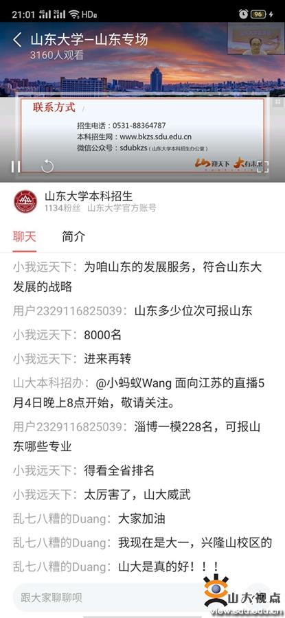 [本站讯]近日,历时近一个月的山东大学2020首轮分省本科招生宣传网络直播活动结束,共有来自31个省份的近7万观众在线收看了直播。