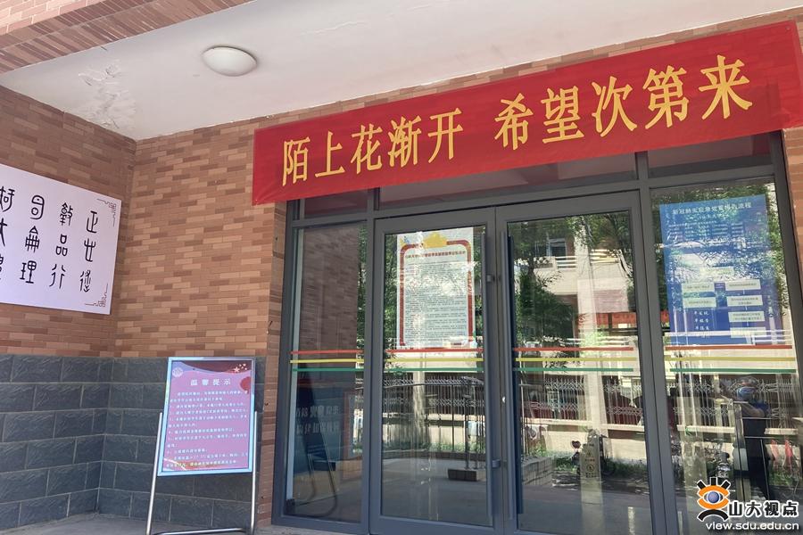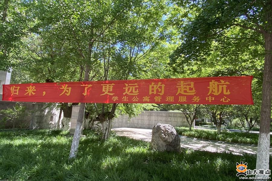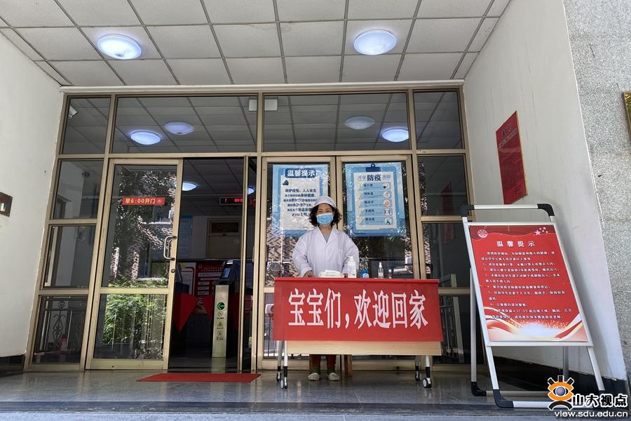 公寓楼门口悬挂起“陌上花渐开,希望次第来”“发扬全国抗疫精神,共建和谐美好公寓”等条幅,欢迎同学们回家。