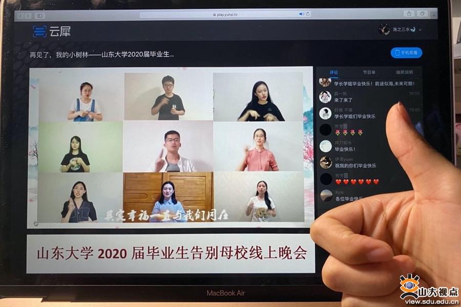 [本站讯]6月19日晚,“再见了,我的小树林”山东大学2020届毕业生告别母校线上晚会如期启幕。因疫情原因,晚会打破常规演出形式,以“云录制”的形式集合一校三地毕业生代表、教师代表等群体,打造以原创作品、歌舞、情景讲述为体裁的艺术作品,将母校情、师生情、同窗情等多种元素融合其中,全景式呈现山大师生的奋斗姿态和蓬勃力量。晚会同时开辟了线上实时互动窗口,为毕业生提供了深入参与晚会、表达情感的平台。