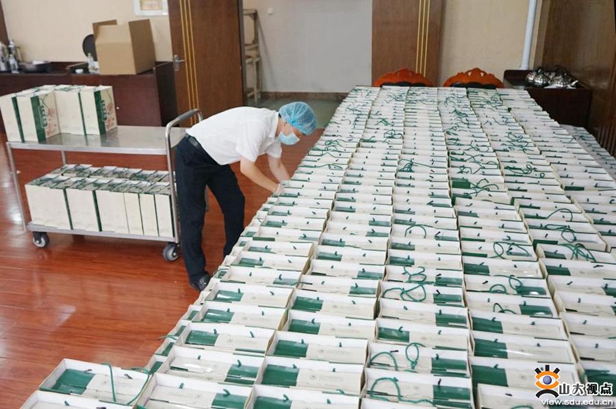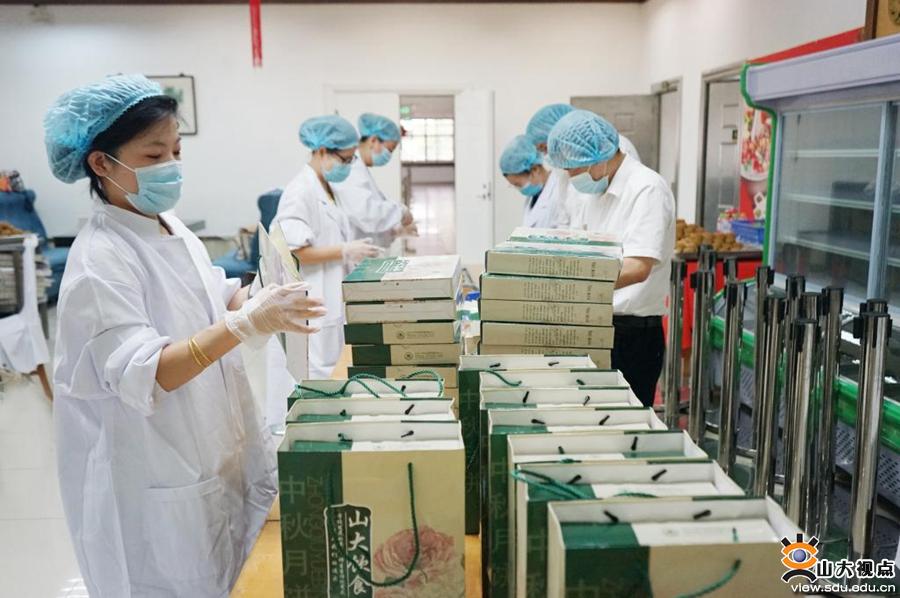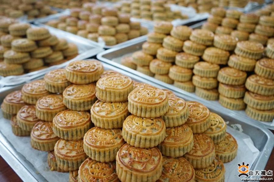 印有“山东大学”字样的山大五仁月饼是山大食堂的传统经典美食,食堂严格按照食品安全标准,选取优质的核桃仁、南瓜子仁、葵花籽仁、黑白芝麻等果仁作为原料,全手工制作。截止9月30日下午,60000多个月饼全部制作完成,并发放到各学院。在中秋月亮升起前,同学们收到了来自学校的一份爱。