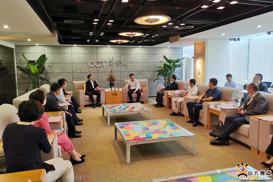 11日上午,王君松一行赴华侨城集团有限公司考察交流。调研团参观了华侨城展厅。深圳华侨城股份有限公司副总裁、华侨城北方投资有限公司党委书记杨杰介绍了集团的基本情况、发展战略、业务布局和发展优势,重点讲解了华侨城在山东省产业布局的情况,希望能与山东大学、深圳研究院加强沟通交流,充分挖掘双方的资源优势,进一步深化校企合作,建立更加稳定密切的关系,未来通过开展实质性战略合作,实现政府、高校、企业多方共赢,为国家地方经济和社会发展作出更大贡献。