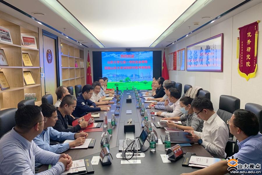 [本站讯]11月24日,山东大学七省一市校友会领导到深圳研究院调研,山东大学深圳研究院常务副院长王明星、副院长傅杰与调研组一行进行了交流座谈。