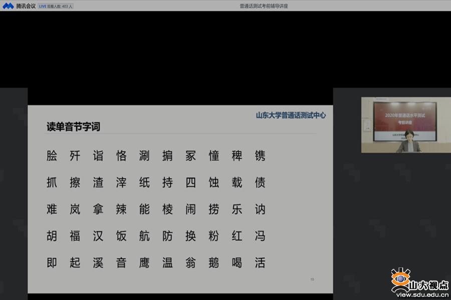 测试前,山东大学普通话测试点于11月17日晚以线上直播的形式举办普通话测试考前培训会,国家级普通话测试员、国际教育学院矫雅楠老师给考生进行了辅导,500多名考生同时观看了考前直播培训。