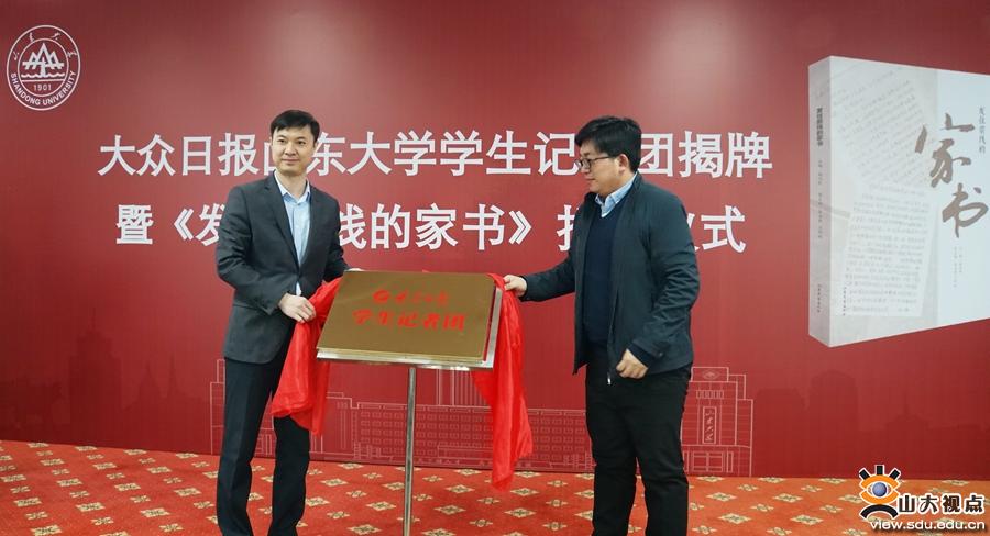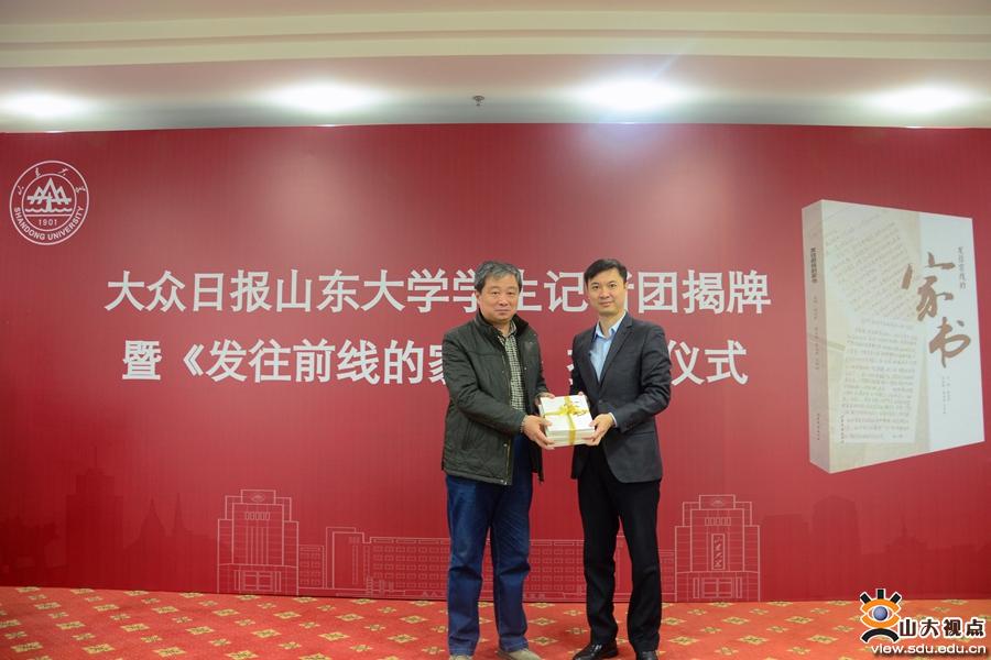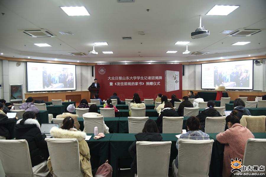 [本站讯]12月7日下午,大众日报山东大学学生记者团揭牌暨《发往前线的家书》捐赠仪式在中心校区举行。大众日报全媒体创新基地、新媒体运营中心主任兰传斌,山东大学图书馆五级职员姜宝良、宣传部副部长鞠晗出席仪式,仪式由山大融媒体中心副主任万广远主持,兰传斌和山东大学融媒体中心副主任、山东大学报社副社长兼主编冯刚共同为大众日报山东大学学生记者团揭牌。姜宝良代表图书馆接受大众日报的赠书。