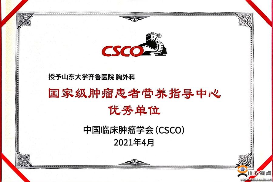 此次CSCO中国肿瘤营养与综合治疗大会共评选出了11个“国家级肿瘤患者营养指导中心优秀单位”,山东大学齐鲁医院胸外科是其中的一员。
