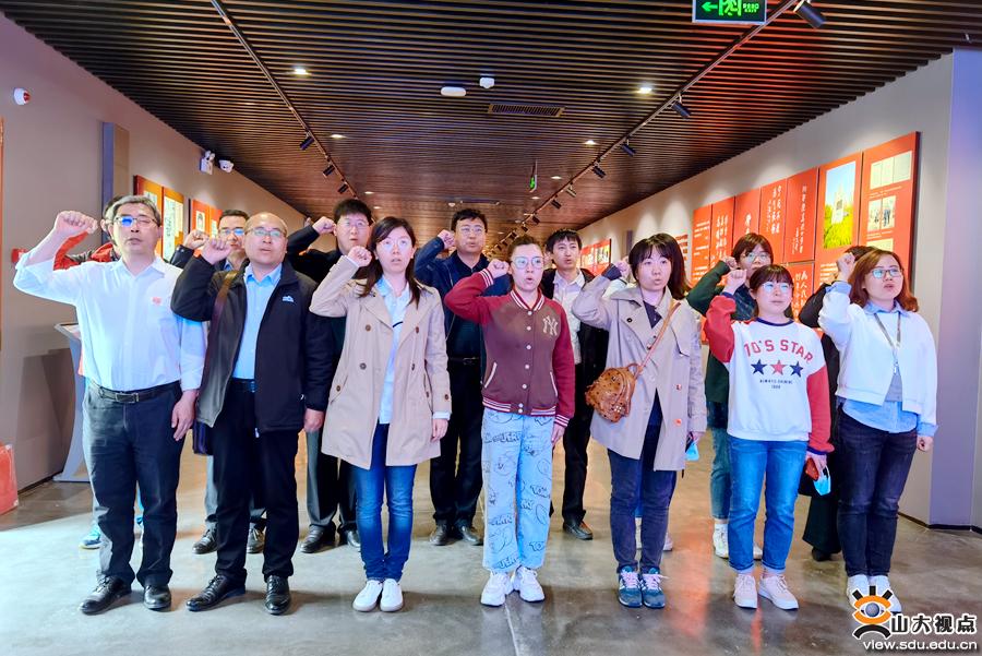 随后,来到省委党校西校区的四五党性教育基地参观学习。1931年4月5日,在济南市纬八路国民党刑场、今省委党校西校区院内,中共一大代表邓恩铭等22位共产党员被国民党反动派杀害,史称“四五”烈士。大家集体参观学习了四五党性教育基地主题展览《穿越时空的党课》,展览采用文字介绍、影像呈现、实物展陈等表现形式,集中展现山东早期党组织发展与斗争、烈士生平和英勇就义等内容,集理论学习、主题党日、党性教育、党史学习教育、缅怀革命先烈为一体。在四五党性教育基地,邓恩铭、王尽美、刘谦初等革命烈士的英雄事迹深深鼓舞激励着大家。最后,党支部全体党员重温入党誓词。