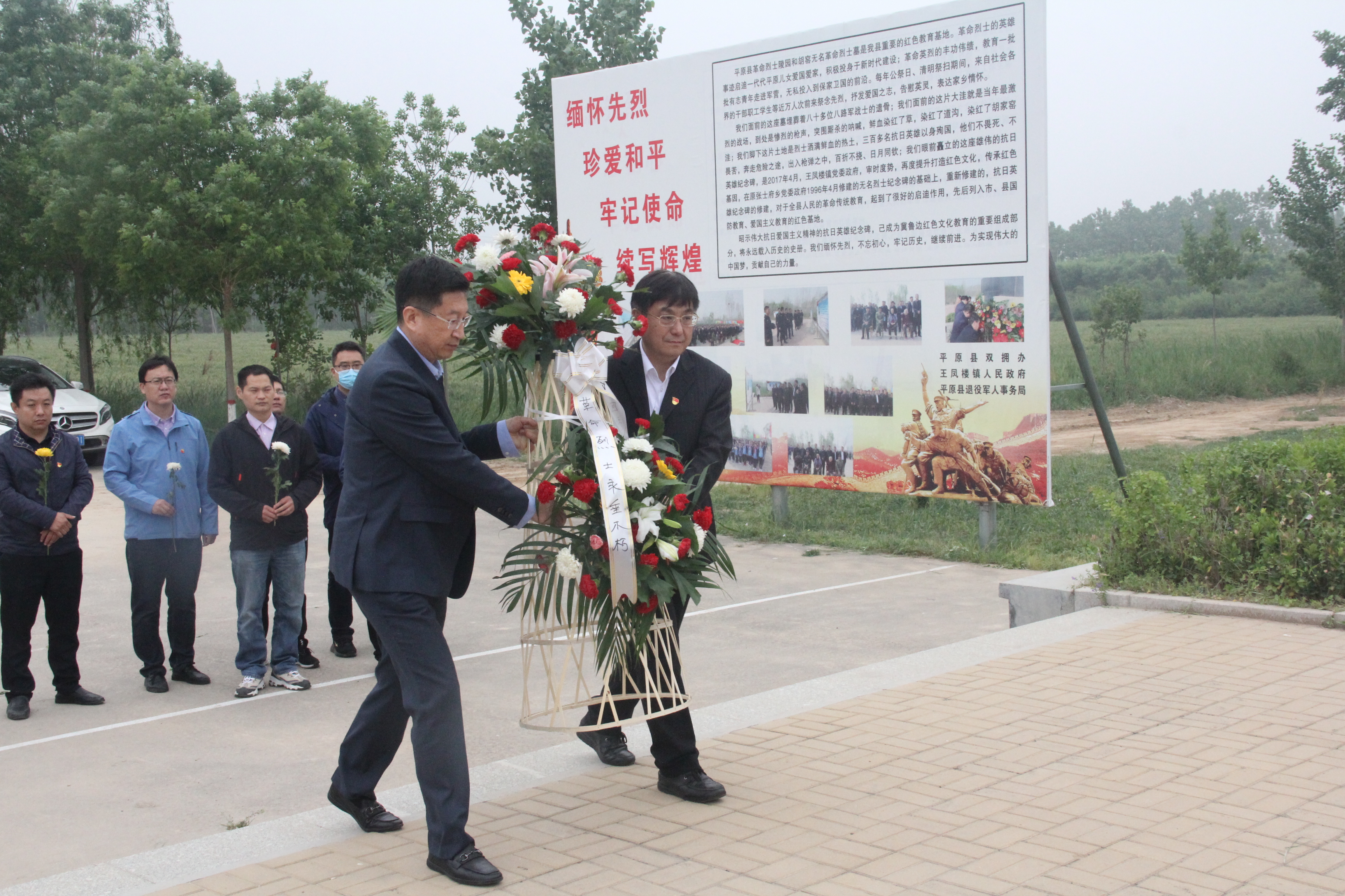 义诊后,专家团队来到平原县革命烈士陵园——胡窑无名革命烈士墓,瞻仰烈士墓,聆听英烈故事。平原历史文化研究会研究员牟书会为专家团讲解先烈故事,1942年抗日军民在平原县王凤楼镇胡家窑村北合众抗敌以及百姓救助八路军战士、战士掩护百姓牺牲的感人事迹让人动容。平原烽火铸英魂,丹心碧血贯长虹,丰碑巍巍,高风永存,党员们瞻仰烈士纪念塔,向革命先烈敬献花圈,悼念革命英雄,学习英烈精神,重温入党誓词,传承红色基因。