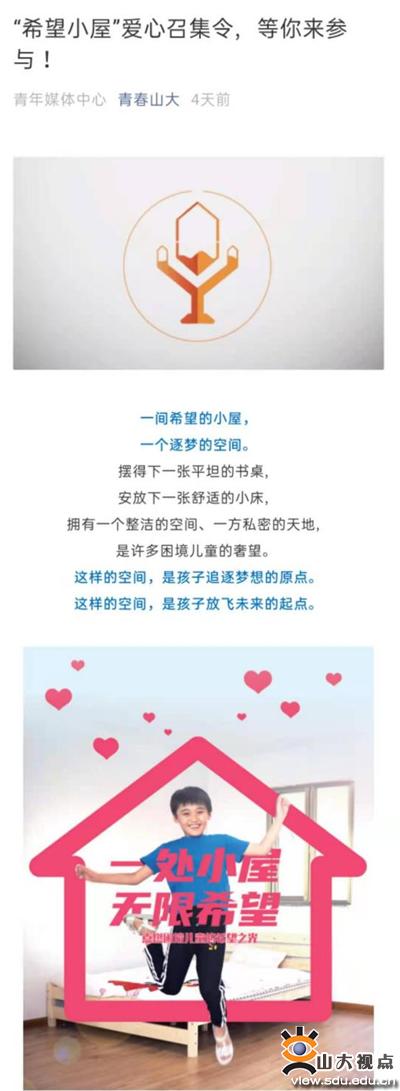 [本站讯]为积极响应团省委号召,推动“希望小屋”儿童关爱项目建设深入实施,扩大“希望小屋”的覆盖面,号召广大青年关心、关注“希望小屋”和困境青少年,撬动更多资源参与“希望小屋”建设,近期,山东大学“希望小屋”儿童关爱项目依托山东省青基会、腾讯公益平台发起“希望小屋5月公益慈善月”活动,采取系列举措,持续为“希望小屋”发展建设持续注入新动能。