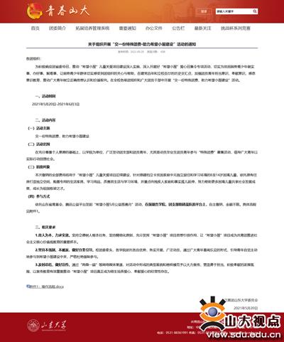 把“战队”组建在团支部上,最大程度上覆盖团员青年。山东大学立足中心工作,化零为整,把一校三地多校区分散力量转化为整体优势、综合优势,由校团委牵头统筹,一校三地各级团组织广泛动员、积极参与,各学院组建“战队”。同时,各学院依托各自优势,将希望小屋与党史学习教育有效融合,将其作为“我为青年做件事”重要抓手,不断点燃团员青年参与热情,见行更见“效。外国语学院组织开展主题团日活动,邀请“希望小屋·山大担当”社会实践专项优秀队员讲述“希望小屋”项目发展的温情故事,引导青年自觉主动地参与到希望小屋建设中来。生命科学学院发布宣传微视频,通过广大青年喜闻乐见的形式,做好希望小屋项目宣传推介。机电信息与工程学院制作“一张图读懂希望小屋”,让希望小屋爱心奉献模式广泛传扬。