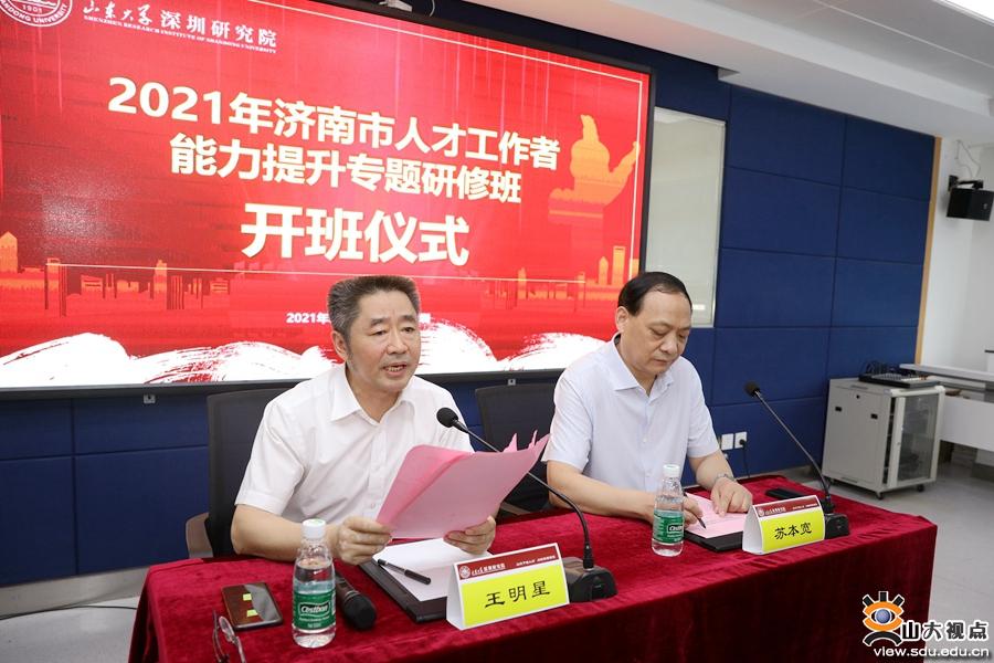 王明星简要介绍了深圳研究院的发展状况和阶段性成绩。他表示,济南市与山东大学历史渊源深厚,相生共荣。为助推济南建设“大强美富通”的现代化国际大都市的目标,山东大学积极组织“山大系”服务济南行动,强力支撑济南市打造成为山东新旧动能转换的新引擎,深圳研究院精准对接济南发展需求,组织推动粤港澳大湾区校友企业家一行与济南市签订7项战略合作协议。王明星对培训班学员提出要求,希望大家统一思想,提高站位;遵规守纪,严格管理;珍惜机会,加强交流,永葆“闯”的精神、“创”的劲头、“干”的作风,开启全面建设新时代现代化强省会新征程。