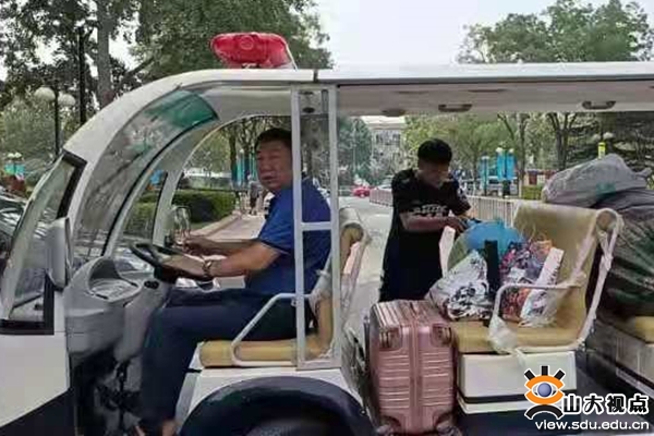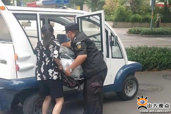 毕业生离校时适逢高温天气,公安处在安排维护好校园秩序的同时,主动为毕业生搬运行李,调用电动警用巡逻车接送学生、运送物品到校门口,各校区校卫队员以及值班工作人员用实际行动为毕业生送上最暖心的“毕业礼物”,为毕业生“再送一程”。57岁的洪家楼校区工作人员荆学民驾驶巡逻车接送毕业生及协助搬运,顾不上吃饭,下了夜班也没有休息,继续为同学拉运行李。他说:“孩子们毕业了不容易,我们辛苦一点没关系,一定让他们记住学校这个家的温暖。”