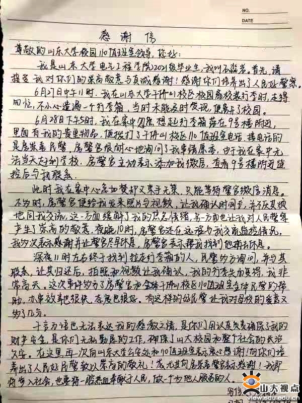 6月2日早上,洪家楼校区公共安全管理科巡逻队员在拱桥西侧发现一辆黑色变速自行车未落锁,推回值班室进行保管,6月3日由失主领走。6月19日,工作人员帮助托福考生找回丢失的手表。6月28日早,队员在校内巡逻时,在一号楼西门前捡到OPPO黑色手机一部,交回值班室保管,约一个小时后将手机返回给前来认领的失主。千佛山校区公共安全管理科帮助学生找回遗留在学校的行李箱,找到行礼箱的学子送上了感谢信表达感激之情。