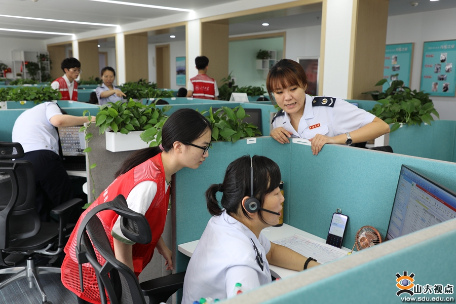 12366纳税服务热线实训队员,首先在工作人员的带领下参观了山东税务12366省级中心的工作环境。展示工作数据的实时监测大屏幕、孵化教室、话务服务区……完备又先进的工作环境让实训队员大开眼界。随后几天,队员们在工作人员的引导下分别参观学习了知识库运维组、质量检测组、投诉举报组和现场管理组的工作岗位。