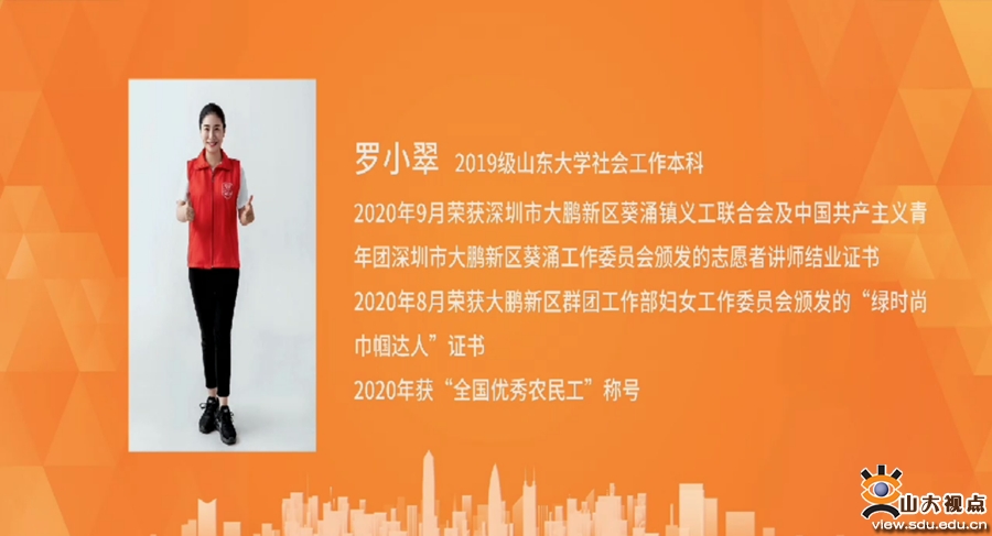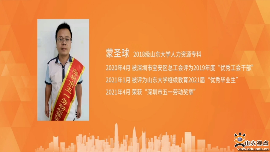 今年是山东大学连续第九年助推深圳市总工会的“圆梦计划”项目,帮扶学生500余人。典礼上共表彰了八位“2021年度圆梦之星”,其中蒙圣球、丁瑞娟和罗小翠三位均来自山东大学。
