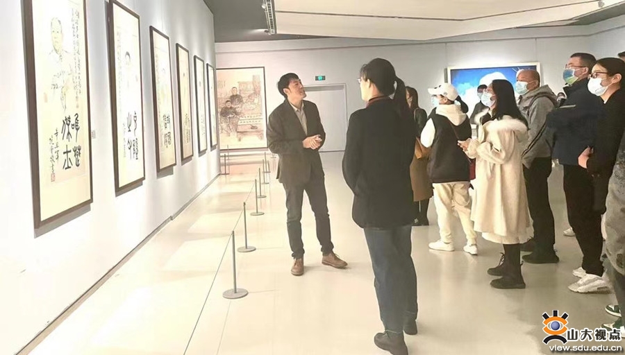 上午十点半,各位代表乘车前往山东省美术馆,集体参观了由山东大学艺术学院全体师生历时一年时间筹备展出的校庆120周年美术大展。本次展览也是艺术学院教书育人成果的一次集中展示。展览共分为校史美术主题创作、馆藏名家作品、美术学科教学成果、书画名家特邀作品四个版块共计200余幅作品,参展作品主题新颖,艺术表现手法丰富多样,每一幅创作均来自对山大之美的感悟,以及对山大校史的艺术思考与诠释。在艺术学院副院长姚榕华的讲解下,团干部通过本次展览深化了美育认识,拓展了美育路径。