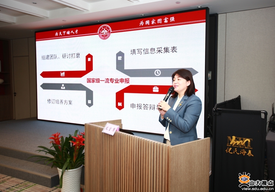 会上,本科生院副院长姜兆亮就山东大学一流本科专业的申报作了详细解读,他通报了本年度一流本科专业建设点的申报要求及目前进展情况,通过系统梳理学校自2019年开展一流本科专业建设以来取得的成效及存在问题,明确了今年申报各环节的重点要求,提出了下一步推进本科专业规划和建设工作的思路和举措。他表示,学校一流本科专业建设工作要把握统筹规划和整体推进原则,围绕立德树人、“四新建设”、课程教材资源开发、教师发展与教学团队建设、学生创新创业与实践教学、教育教学研究与改革等内容扎实推进。