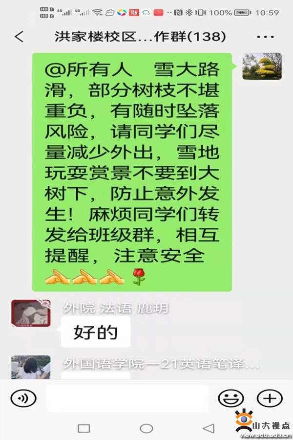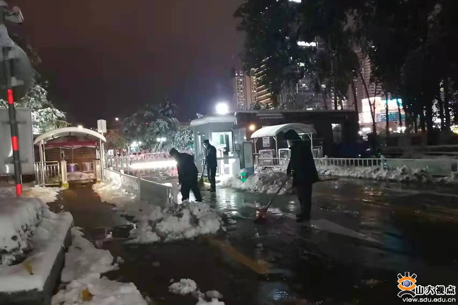 11月8日是周一,是工作日,夜班的同志们想到周一早晨是校门口最为繁忙的时刻,晚上不把积雪打扫干净,早晨需要给进出人员查健康码、温体温、提醒戴口罩,是没有时间去打扫积雪的,是没有办法保障师生安全的,道路结冰湿滑容易摔倒,于是他们把工作做到了前面。可能正是有这样的思维,这样的行动,才有安全、温馨的校园。