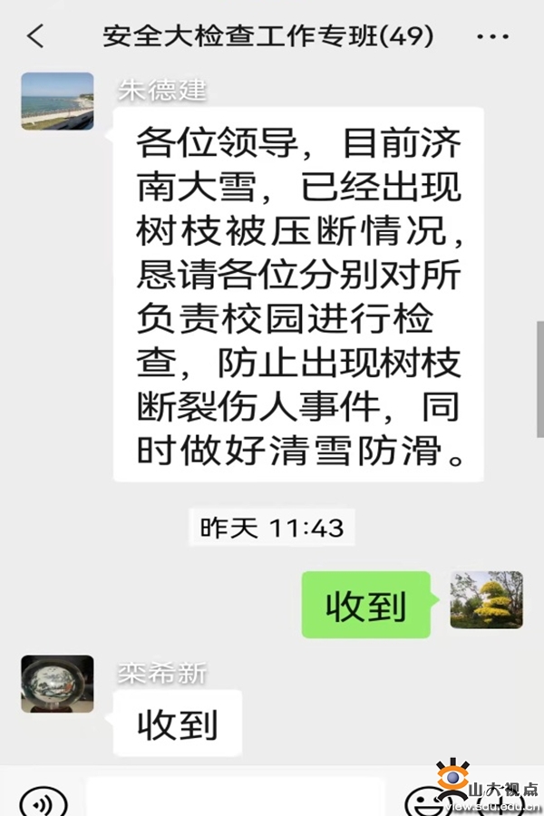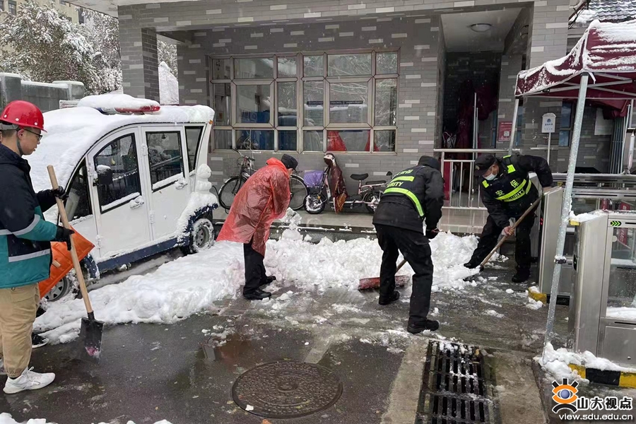 学校安保人的思考更全一些。看准隐患点,怎么防范?怎么消除?及时清除校园进出口积雪、提醒师生不去危险地带、面对大雪商请大家共同努力、主动沟通协同作战、先把有坡度的车库出入口清理、周日夜班的同志们一定要把门口的积雪清理完毕,避开周一进出校门门卫管理繁忙时刻……周一艳阳高照,但气温依然较低,按照指令,各岗位安保人为了避免师生在湿滑路面摔倒,继续清扫路面积雪。