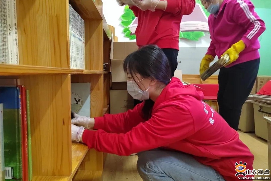 座谈会结束后,研支团成员和幼儿园老师们一起打扫布置了刚刚装修好的校园,将杂乱的玩具教具清洗干净并布置整齐,清扫落叶、擦拭橱柜、清理图书室、整理图书、分类归置摆放室外活动器械,为孩子们创造安全舒适的学习生活环境。