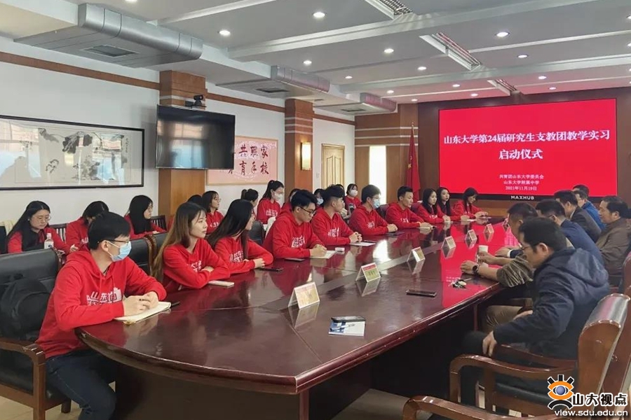 [本站讯]11月19日,山东大学第24届研究生支教团教学实习启动仪式在山东大学附属中学举行,山东大学附属中学党委书记李玉亮、山东大学团委书记姜炳刚及相关同志与山东大学第24届研究生支教团全体成员参加,仪式由山东大学团委志愿者指导中心马海波主持。