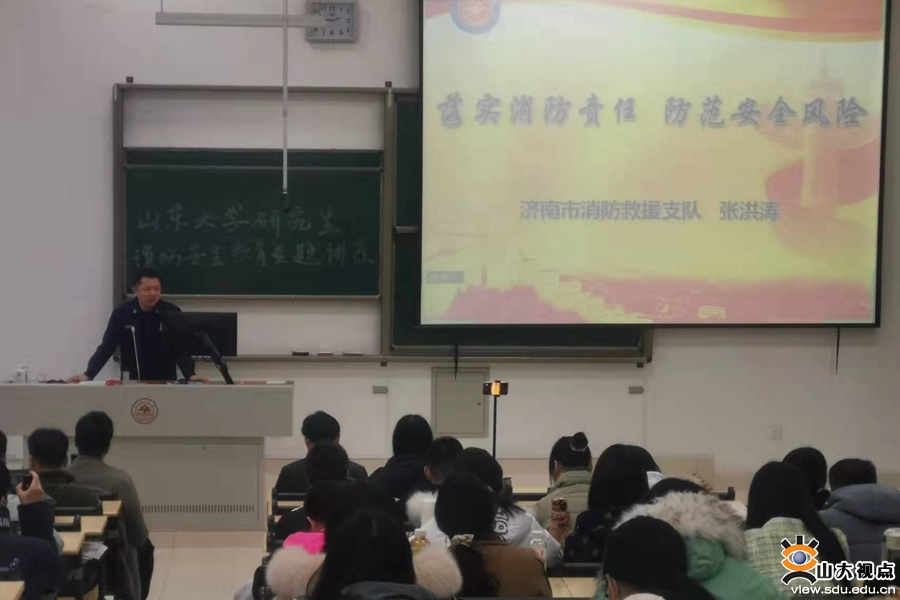 在以“落实消防责任,防范安全风险”为主题的研究生校园消防安全讲座上,济南市消防救援支队火调技术处张洪涛担任主讲,为大家讲解了最近几年发生在高校实验室、学生宿舍的消防案例,配合一张张触目惊心、发人深省的图片和视频,讲述了身边的火灾隐患和防范常识,介绍了当代大学生应该担负的消防责任和义务,让大家对于消防法规、消防安全知识有了更加深切的认识。公安处副处长董太华出席活动,线下线上260余名学生参加学习。