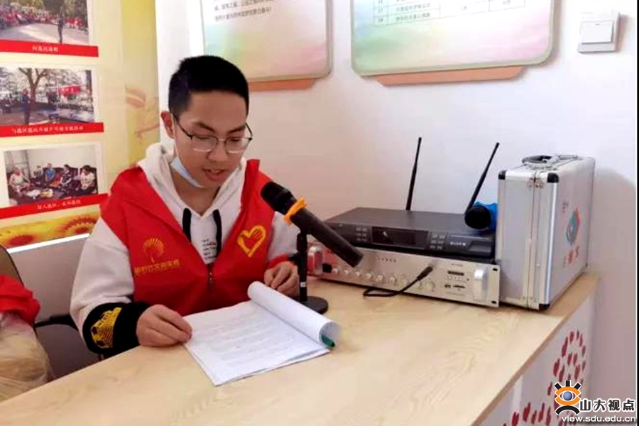 “大家好,这里是小喇叭广播站!我是来自山东大学的播音员,今天播音的主要内容有……”每天,七里堡社区的“小喇叭”里都会传来熟悉的声音——在悠闲的午后,沐着一路阳光、来到七里堡,和大厅工作人员问声好,然后脚步轻快地推开播音室的门、打开话筒,流利又欢快地说出播报内容……对于经常参加七里堡“小喇叭”志愿服务活动的张同学来说,这几乎是她每天午后的活动安排。