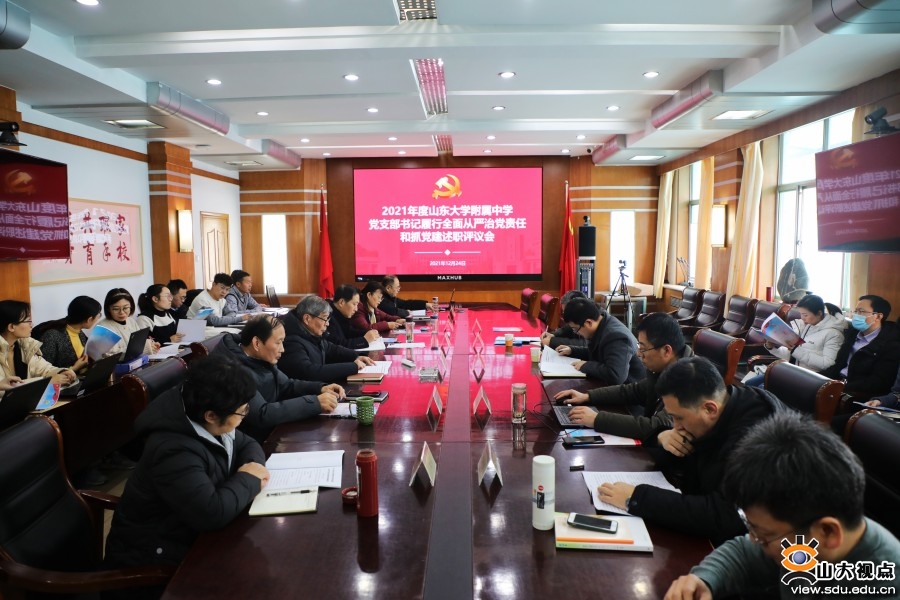 [本站讯]为深入学习贯彻习近平新时代中国特色社会主义思想和党的十九届六中全会精神,压实党支部书记履行全面从严治党和基层党建责任,以高质量党建推动附中各项事业的快速发展,结合附中党建工作实际,12月24日,附中党委在洪家楼校区会议室举行了2021年度党支部书记履行全面从严治党主体责任和抓基层党建述职评议会。山东大学党史学习教育第五指导组组长任若强、成员王永军出席会议,附中党委副书记申桂华主持会议。