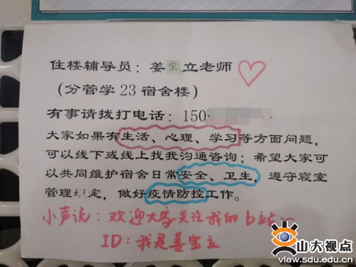 商学院辅导员姜文立进驻了学23号楼,成为驻楼辅导员。作为一名拥有将近2600粉丝的UP主,在搬进23号楼的第一天,就以网名“姜宝立”特有的亲切方式向大家传达了自己的工作内容和联系方式,并且鼓励同学们,如果有心理、学习或者生活方面的问题,积极与他进行沟通,用独特的“温柔力量”,温暖学生的心灵。