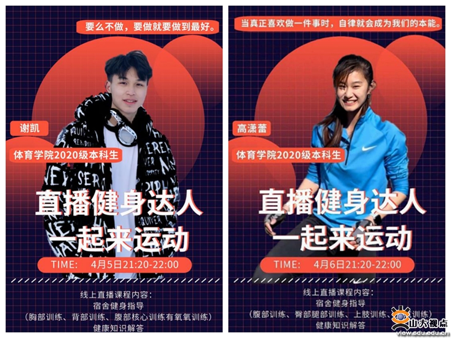“一起来运动”健身教学线上直播课活动已成功举办两场,邀请了体育学院2020级本科生谢凯、高潇蕾在抖音直播平台“山东大学”账号为山大学子进行健身指导。4月6日晚,谢凯带领大家进行了有氧健身训练,展示了多种运动姿势,强调了重点动作细节,并且积极回答弹幕区的提问,解答了运动拉伸、有氧频率等问题。4月7日晚,高潇蕾和观众一起进行了宿舍腹部训练的锻炼,并与弹幕区观众实时互动,回答了有关训练饮食、减脂饮食等健康知识的问题。此外,高潇蕾还建议大家在校期间自律运动,提高自身素质,并鼓励大家交流更多有关健身锻炼的信息。