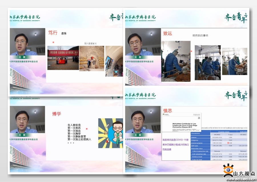 王昊以“博学 慎思 笃行 致远——医路历程之分享”为题,为第一临床学院学生、住院医师规范化培训学员、齐鲁医院团员青年和医学部分学院师生带来了一场精彩的讲座。他结合自身经历娓娓道来,围绕早期在山大医学院求学经历、远赴海外留学体会、到齐鲁医院参加住院医师规范化培训心得、工作后立足重症医学本职岗位、义无反顾援鄂抗疫、积极投身威海等省内外疫情防控一线、远赴陕西省清涧县“造血式”对口支援帮扶等方面进行了详细分享。王昊以“博学、慎思、笃行、致远”四个关键词,将多年来的个人成长经历、心路历程、抗疫力量融入讲堂中,分享了自己医路成长过程中的深刻感悟与体会,体现了立德树人的教育理念、“生命至上、举国同心、舍生忘死、尊重科学、命运与共”的伟大抗疫精神和“博施济众、广智求真”的齐鲁精神。讲座最后,王昊勉励临床学生和青年医师们要勇于挑战自我,拥抱新鲜事物,不畏逆境和失败,积极换位思考,用爱心和责任心来呵护患者,学会团队合作与自我减压等,希望大家坚守初心,练就过硬本领,将仁心仁术、医者大爱、无私奉献的精神在心中落地生根、开花结果。