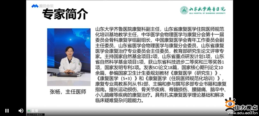 [本站讯]在做好防疫工作的同时,更应正确运动强健体魄。4月20日晚,山东大学齐鲁医院驻洪家楼校区医疗服务队邀请到山东大学齐鲁医院康复科副主任张杨教授以“膝关节运动损伤后的康复”为主题,为大家作了第四期“Health Time”专家科普讲座。洪家楼校区及其他校区各学院的师生参加线上讲座。