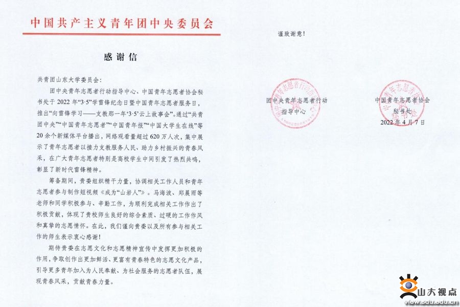 [本站讯]近日,团中央青年志愿者行动指导中心、中国青年志愿者协会来信对山大在2022年“3.5”学雷锋纪念日暨中国青年志愿者服务日中的工作表示肯定,向山东大学研究生支教团参与“向雷锋学习——支教那一年‘3.5’云上会”工作的师生表达感谢。