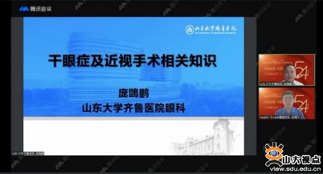 [本站讯]校园封闭化管理期间网课任务较多,干眼症成为困扰师生的常见问题。为帮助师生们减少眼部不适、普及科学的护眼方法,5月4日晚,山东大学齐鲁医院驻洪家楼校区医疗服务队邀请山东大学齐鲁医院眼科副主任医师庞鵾鹏教授以“学业繁重如何保护眼睛——干眼症及近视手术相关知识”为主题,为大家作了第七期“Health Time”专家科普讲座。洪家楼校区及其他校区各学院的师生参加线上讲座。