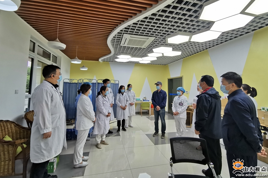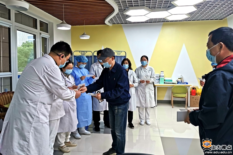张永兵给临时医疗点的医护人员递上了校党委书记郭新立、校长樊丽明书写的慰问信,送去了慰问品,并了解了他们一个多月以来的工作生活情况。他表示,在严峻的疫情防控形势下,医护人员舍小家顾大家,不辞辛劳、夜以继日、义无反顾地承担起校园封闭化管理期间留守师生的医疗保健任务,为广大师生医务员工的健康筑起了一道坚强的壁垒。尤其是齐鲁医院的医生护士们,医院一声令下他们立即驻扎到校区医疗点,投入到紧张的工作中,为齐鲁医学精神做出鲜明的时代注解。他向大家表示衷心的感谢,并代表学校党委和齐鲁医学院疫情应急处置工作指挥部祝大家节日快乐!