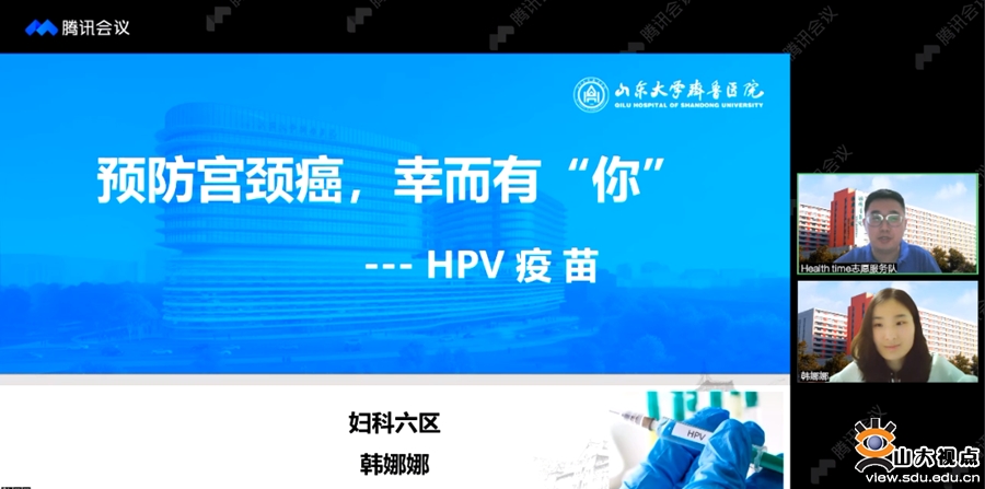 [本站讯]守护宫颈健康,从科学认识HPV开始。5月18日晚,山东大学齐鲁医院驻洪家楼校区医疗服务队邀请山东大学齐鲁医院妇科六区带教老师韩娜娜以“预防宫颈癌,幸而有‘你’——HPV疫苗”为主题,为大家作了第九期“Health Time”专家科普讲座。洪家楼校区及其他校区各学院的师生参加线上讲座。