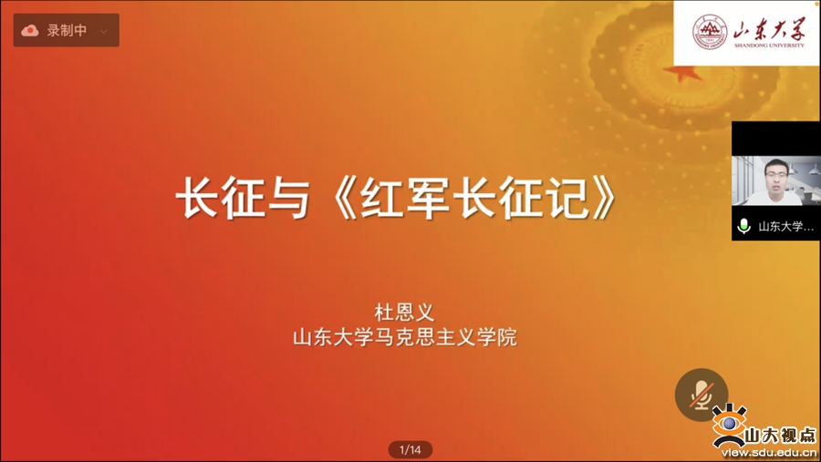 山东大学马克思主义学院杜恩义助理研究员作了题为“长征与《红军长征记》”的主题讲座,梳理了长征过程中以及之后无数共产党人汇聚在信仰的旗帜下,为了理想信念,前赴后继,舍生取义的感人故事,讲述了解放战争时期的真实血泪奋斗史。他提出,学生党员在重温历史上重要会议、重要事件、重要人物的过程中,要结合新的时代条件和实践要求,把革命传统、优良作风融于新的党建伟大工程中去,借力推进中国特色社会主义伟大事业向前发展,以史为鉴,开创未来。