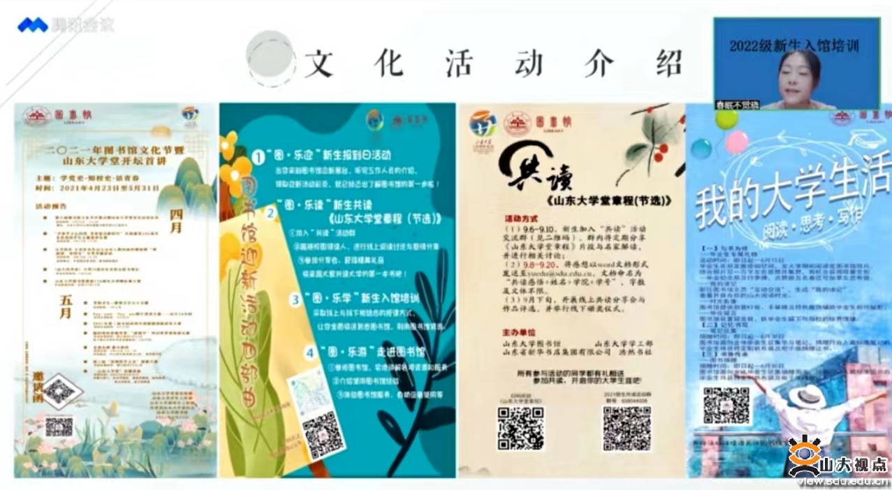 在本科新生的入馆教育中,图书馆基础服务中心结合学校疫情防控工作及新生教育的相关部署和要求,采取腾讯会议直播的方式对济南、青岛两地本科新生进行入馆教育培训,共开展专题培训3场,培训人次达8000余人,实现对本科新生全覆盖。在前期完成新生专区基础服务模块内容的更新,以及服务小视频制作等工作基础上,培育优秀授课馆员,围绕图书馆概况、基础服务介绍、带你走进图书馆、文化活动介绍等内容,进一步规范课件,全方位展示图书馆的功能与服务。并短时间内高效完成与各学院的对接,保证了入馆教育工作顺利进行,让大家体验了一场特殊的“沉浸式入学”,感受到图书馆老师的专业和热情。