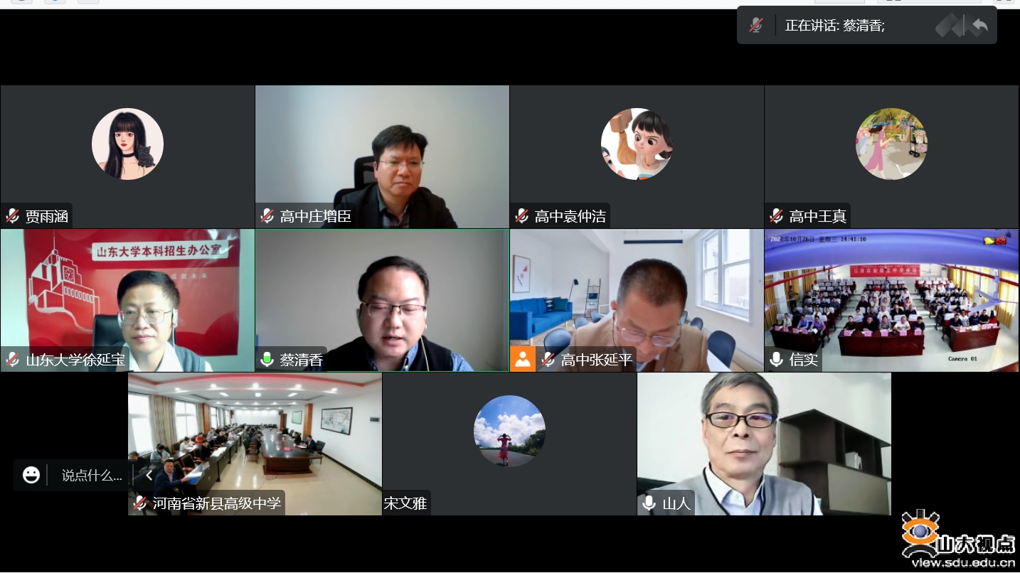 [本站讯]10月26日,山东大学托管帮扶江西吉安县立中学、河南新县高级中学项目启动仪式以线上会议形式举行。山东山大基础教育集团总校长、山东大学附属中学校长赵勇,河南新县高级中学校长吴德明,江西吉安县立中学副校长肖玉红,山东大学党办校办副主任蔡清香,山东大学本科招生办公室副主任徐延宝,山东大学附属中学副校长庄增臣参加会议。启动仪式由蔡清香主持。