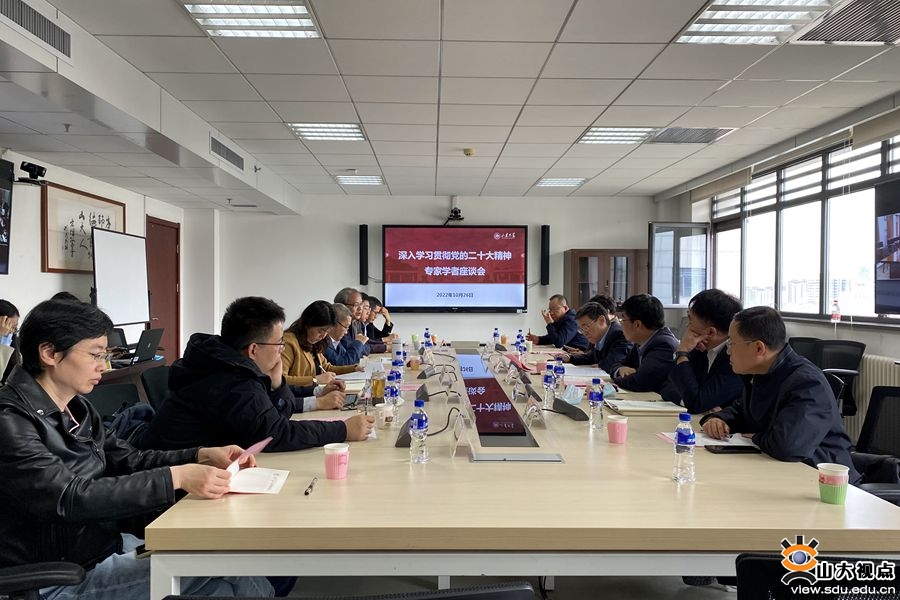 人文社科研究院院长黄凯南主持会议。与会的20多位专家学者代表围绕党的二十大精神,结合学科特点和研究方向,深入交流了学习心得体会,对下一步推进党的二十大精神的学习宣传和研究阐释工作提出了很好的建议。文学院胡友峰教授表示,党的二十大报告提出了人与自然和谐共生理念,保护自然、促进自然,为生态美学奠定了坚实的基础,从生态整体高度建构了重大启示。哲学与社会发展学院冯波教授认为,在研究阐释中要发挥山大在儒学研究、易学研究、马克思主义理论研究方面的优势,坚持“儒马汇通”,把马克思主义与中华优秀传统文化融会贯通起来。儒学高等研究院陈峰教授认为,要实现理论创新、科教兴国、人才强国、文化建设等方面目标,关键要加强哲学社会科学人才队伍建设。国际教育学院马晓乐教授表示,数字中国不单与经济发展有关,在教育领域也应该贯彻数字的问题,把数字化转型到高等教育的领域当中。新闻传播学院刘明洋教授表示,将组织学院学者积极策划选题,在主流思想理论建设与对外传播方面开展深入研究。政治学与公共管理学院孔新峰教授认为,共同体是社会文明治理的载体,用新安全格局保障新发展格局。法学院(威海)武飞教授表示,中国共产党找到了回答历史周期率的两个答案是人民监督和自我革命,历史周期率提出的问题是需要我们着重研究的问题。马克思主义学院郑敬斌教授表示,要加强对党的二十大报告中命题的学理化体系化研究,全力做好宣讲、解读和阐释工作。人文社科期刊社社长魏建教授表示,将设置学习贯彻党的二十大精神专栏,支持学者聚焦中国式现代化等命题从不同角度展开研究阐释。外国语学院牛林杰教授认为,要加强外语学科与新闻传播学科的交叉融合,增强文化传播力影响力,提升国际传播效能。艺术学院姚榕华副教授提出,要发挥艺术学科特色,用创作描绘新时代,推进文化自信自强。经济学院张伟教授表示,高水平市场经济体制、数字经济与实体经济融合发展等理念,为新时代经济发展指明了方向。《文史哲》副主编李扬眉副教授表示,在研究阐释上要加强与青年学者的联系,进一步发挥好《文史哲》在提高历史自信、文化自信方面的作用。《高校辅导员》主编杨玉研究员表示,以期刊为阵地系统组织学习贯彻党的二十大精神,加强相关选题研讨论证并开辟专栏做好成果展示。马克思主义学院(威海)房世刚副教授认为,贯彻落实好党的创新理论,需要深入领会坚持自信自立的道理、学理、哲理,做到知其言知其意,做到知其所以然。法学院崔永东教授认为,人民中心论落实到法治方面就是人权保障方面,必须做到知行合一、良法善治。人文社科青岛研究院张林波教授表示,生态产品价值实现意义重大,是第一次写进党代会,要提前做好研究选题准备。《当代世界社会主义问题》期刊张淑兰教授表示,将聚焦政党文明、统筹国内国外两个大局、社会主义新阶段、中国式现代化等命题设置专栏并组织研讨交流。管理学院王益民教授认为,管理学的人才培养、教学要在党的二十大精神指引下回归到我国的情境当中来,打造自己的底气和骨气,为管理理论发展作出贡献。历史文化学院代国玺教授表示,传承中国式现代化要从深入探求中华文明的历程和系统挖掘中华优秀传统文化的时代价值两方面着力。《周易研究》编辑部主任李尚信教授表示,开辟马克思主义中国化时代化新境界是报告中最具创意的内容之一。《民俗研究》期刊龙圣教授表示,民俗研究将在乡村振兴研究、非遗研究、民俗史研究、礼俗互动研究等方面着力,并积极推动英文期刊建设。文化遗产研究院姜波教授表示,将中华文化遗产保护好宣传好是对外输送中国名片的重要途径,山大要积极发挥考古学科优势,在世界遗产保护上发挥力所能及的作用。