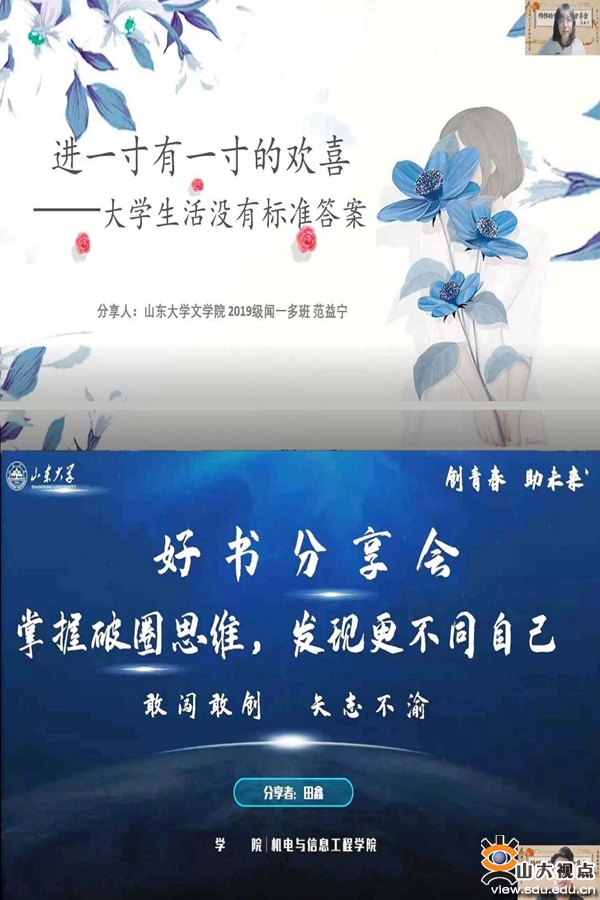“榜样的力量·好书分享会”邀请校长奖获得者代表以“校园阅读推广大使”的身份,分享学习经验、进行好书推介,发挥青年榜样的模范带头作用,推进“书香校园”建设,增强新时代山大文化和山大精神的感染力和驱动力。