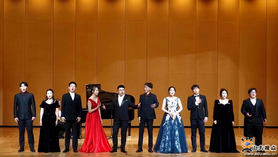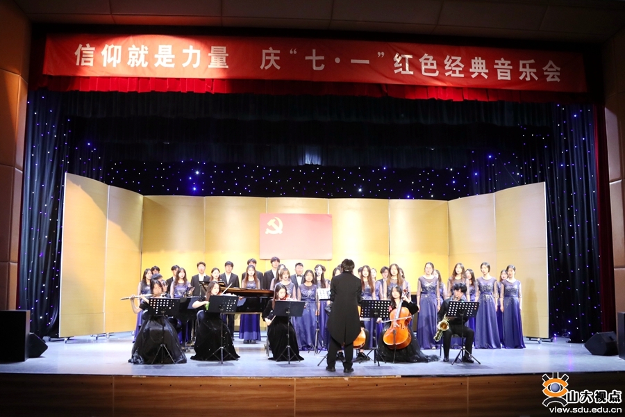 6月19日,庆“七﹒一”红色经典音乐会上,艺术学院(威海)党员教师们带领着学生党员将日常教学中学习的12首红色经典曲目进行了精心编排,当《我的祖国》《保卫黄河》《唱支山歌给党听》《映山红》……一首首耳熟能详的音乐响起,师生们声情并茂的现场展示,迅速引起了在场观众的强烈共鸣。这场精彩的教学汇报表演立足现实、反映时代,寓情于景,情景交融,以一种特殊形式的“音乐思政课”展现在师生面前,让师生在唱响红色经典中感悟信仰力量。
