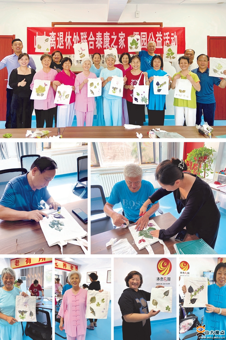 [本站讯]9月14日上午,离退休工作处携手泰康之家在趵突泉校区离退休活动中心举办“快乐吧”手工坊活动。活动现场,工作人员为前来参加活动的老同志们分发了制作工具,认真讲解了植物拓染的环节,并耐心指导他们操作。