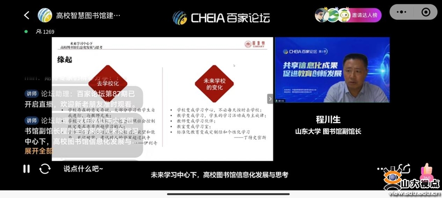 [本站讯]10月7日晚,山东大学图书馆副馆长程川生参加《CHEIA百家论坛》,围绕“高校智慧图书馆建设的探索与实践”作主题分享。论坛采用线上直播形式,近两千人线上观看。