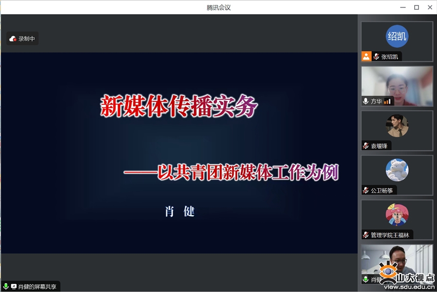 开班仪式上,全体学员共同观看了菁英班往期成员参与制作的《山东大学青年媒体菁英班》短片。开班仪式后,肖健以“新媒体传播实务”为题,结合共青团新媒体工作鲜活案例,围绕宣传工作的价值、宣传环境的变化、宣传方式的要求等方面,对青年网络宣传工作进行讲解。肖健特别提到,对青年人做宣传,做思想引领,首先就是要和青年人交流,绝不能简单粗暴、自以为是地单向输出。
