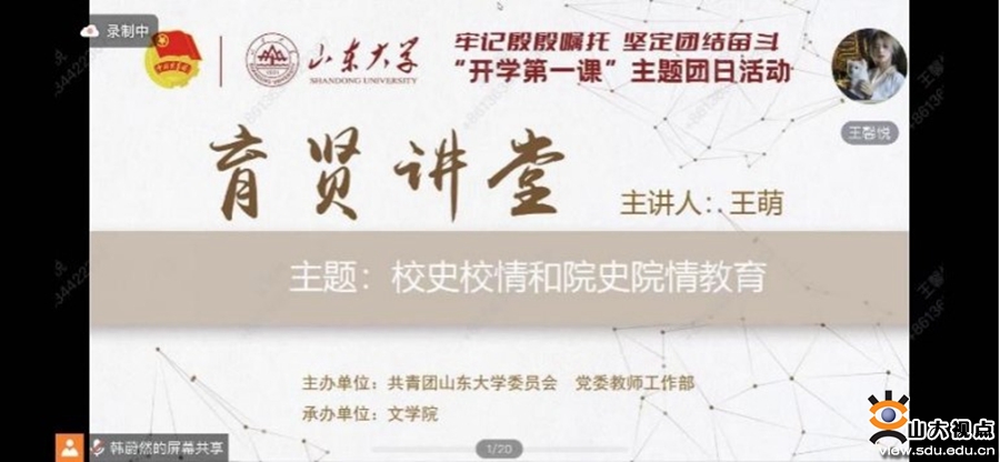 为增进团员青年对院校历史和现情的认知,培养同学们的集体归属感和荣誉感,文学院线上举办“育贤讲堂”之2023级新生理想信念与校史校情教育活动。院党委副书记王萌详细介绍了学校的历史沿革、办学章程和精神理念,向大家介绍了在成仿吾校长作词基础上改编而成的新校歌,以及季羡林、闻一多、臧克家等知名校友,鼓励同学们积极参加学院开设的读书会、学年论文报告会、访学游学项目等活动,坚守学术理想,以扎实纯正的态度做学问,行稳致远、厚积薄发,成为最具创造力的新青年。
