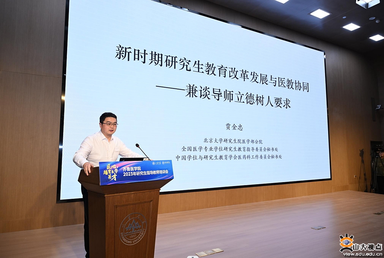 [本站讯]为深入学习贯彻党的二十大精神,以强化导师队伍建设来回答“培养什么人、怎样培养人、为谁培养人”这一教育根本问题,11月16日,齐鲁医学院召开医学学科2023年研究生指导教师培训会。本次会议以“匠心,培育医学英才”为题,聚焦立德树人根本任务,从“课程思政”“道术合一”“医者仁心”等多维度阐述新时期研究生教育使命和如何筑牢研究生培养质量的生命线。山东大学副校长易凡出席会议并致开幕词。